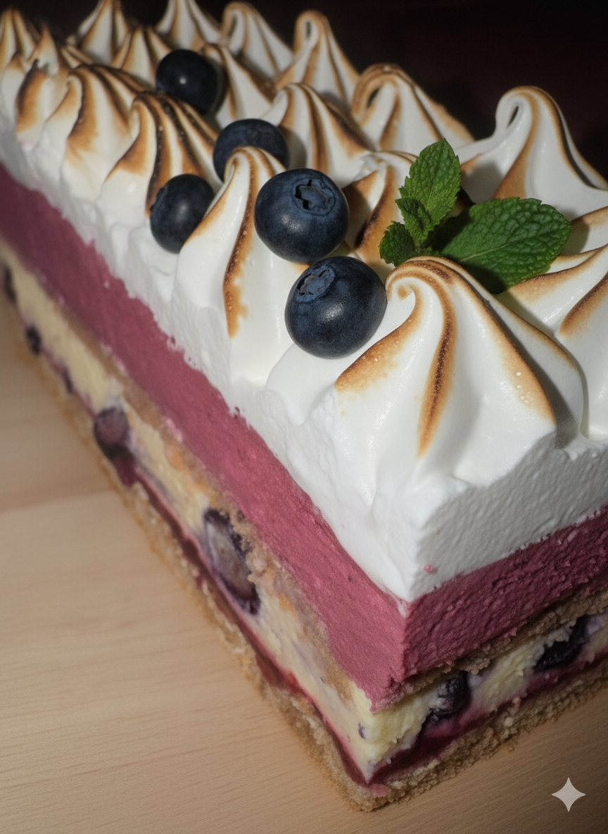 La douceur boisée du biscuit châtaigne, le caractère acidulé de la framboise et des myrtilles, la fraîcheur de la bavaroise vanille et de la mousse mûre, le tout couronnée d’une meringue fondante.